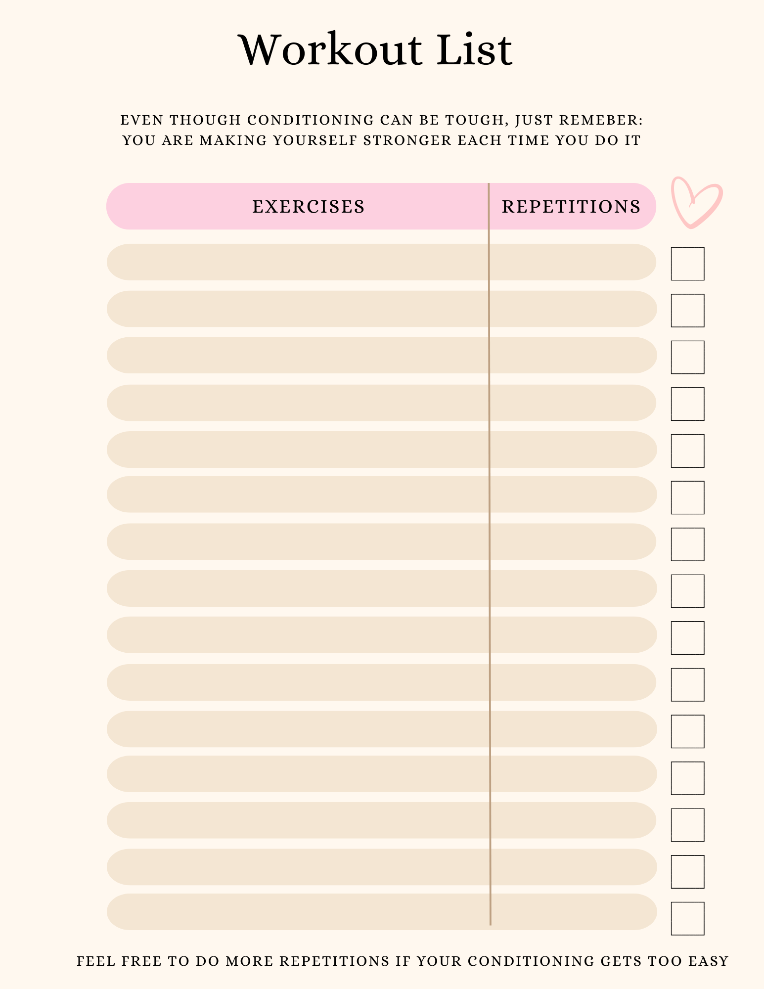 This printable PDF allows you to keep track of your gymnastics or dance conditioning exercises in a fun way. Simply print the PDF, write the exercises you need to do, and check them off once you have completed them.